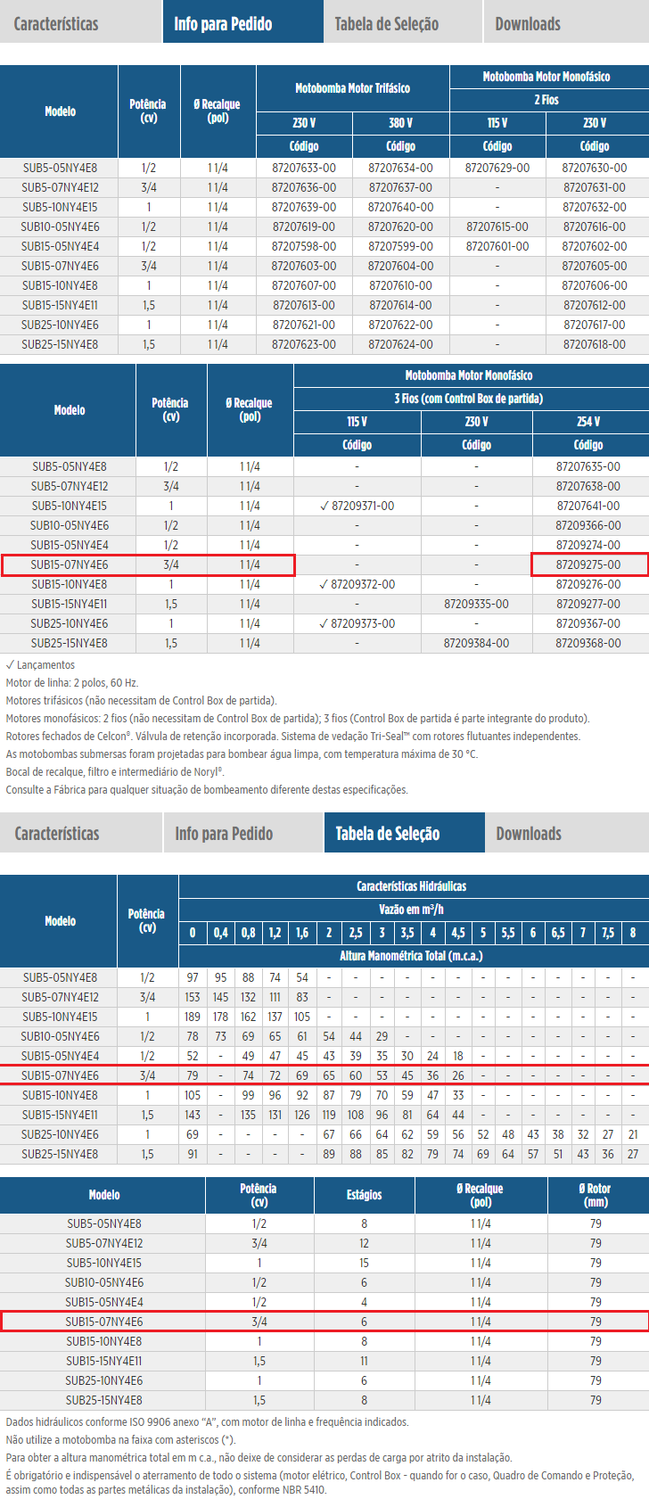 Bomba Submersa Schneider centrífuga multiestágio, acopladas a motores elétricos projetados especialmente para funcionar dentro da água, a grandes profundidades. A Bomba Submersa SUBNY é utilizada para bombeamento de água subterrânea em poços tubulares com diâmetro interno a partir de 4”. Um ano de garantia conforme termo do certificado que acompanha o produto.
