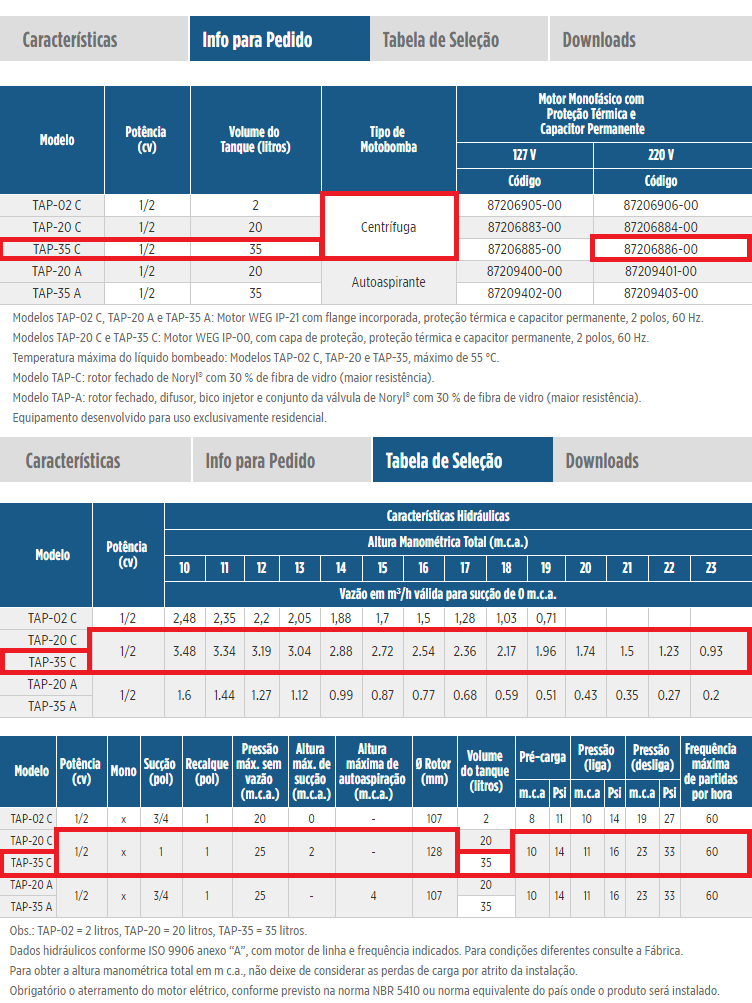 Bomba de Água Pressurizadora Schneider TAP-35 C 1/2 CV 220 V Monofásico