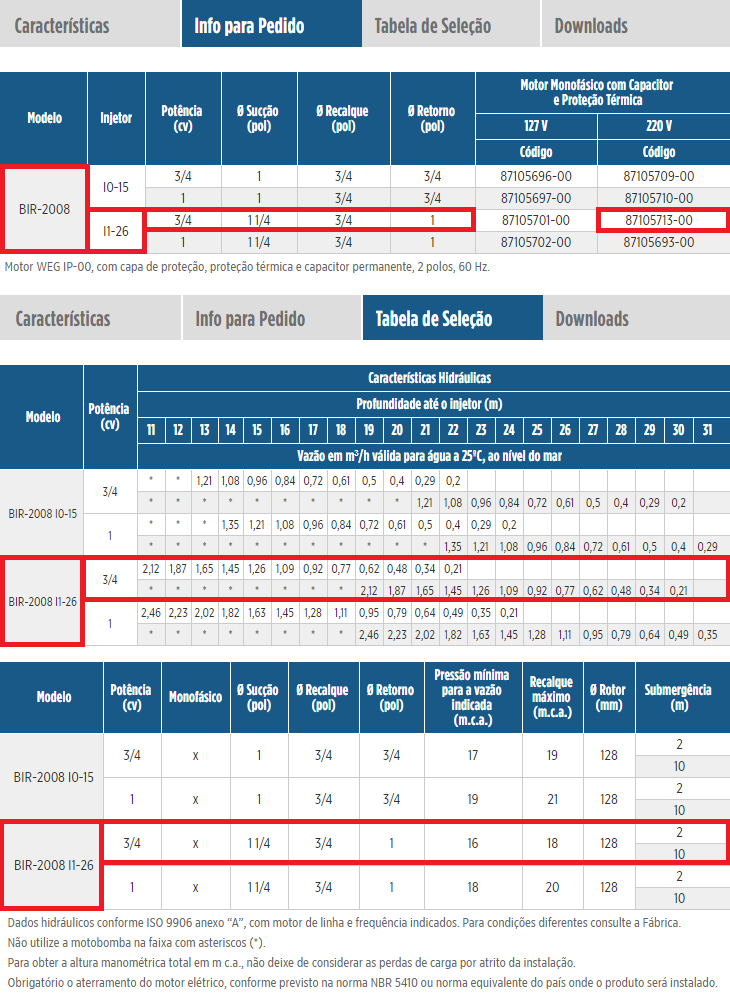 * Injetor I0 - Para submergências inferiores a 10 metros, considere um decréscimo médio de 7% na vazão para cada metro a menos, tomando como referência os valores de vazão da submergência de 10 metros.