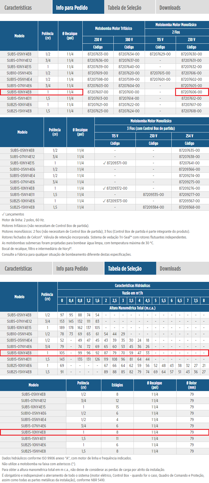 Bomba Submersa Schneider centrífuga multiestágio, acopladas a motores elétricos projetados especialmente para funcionar dentro da água, a grandes profundidades. A Bomba Submersa SUBNY é utilizada para bombeamento de água subterrânea em poços tubulares com diâmetro interno a partir de 4”. Um ano de garantia conforme termo do certificado que acompanha o produto.