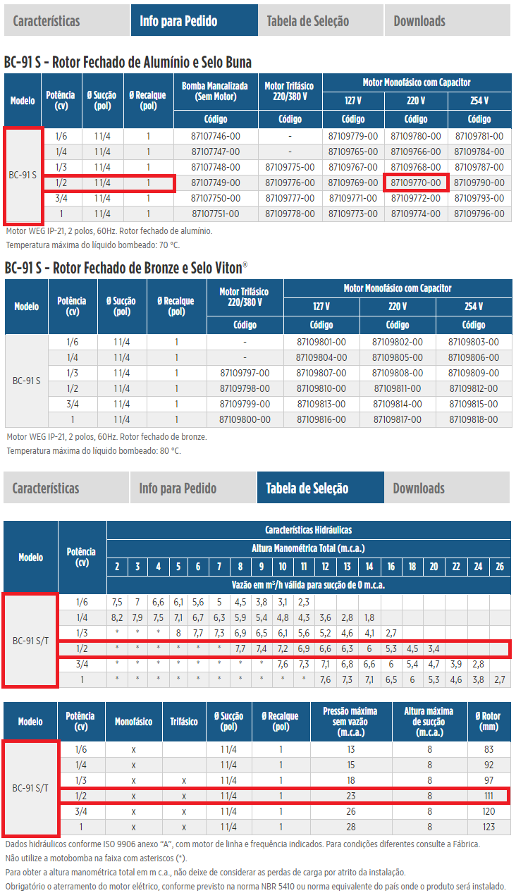 Bomba de Água Schneider Centrífuga BC-91S 1/2 CV Trifásico (Rotor Fechado de Bronze)