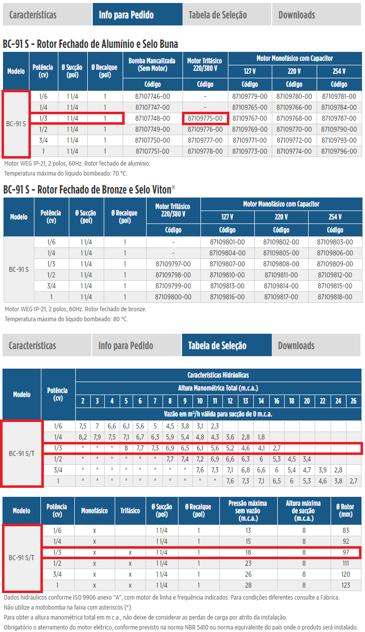Bomba de água Schneider Centrífuga BC-91S 1/3 CV Trifásico (Rotor Fechado de Alumínio)