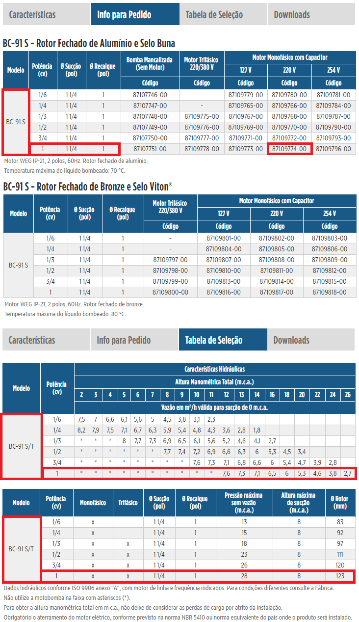 Bomba de Água Schneider Centrífuga BC-91T 1,0 CV Trifásico 220/380 V (Rotor Fechado de Bronze)