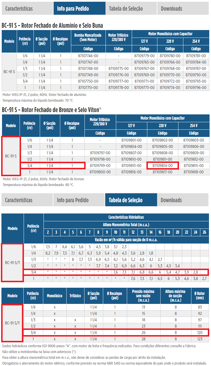 Bomba de Água Schneider Centrífuga BC-91S 3/4 CV Trifásico (Rotor Fechado de Bronze)
